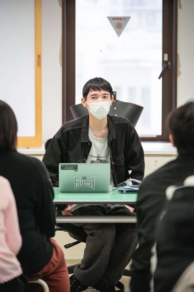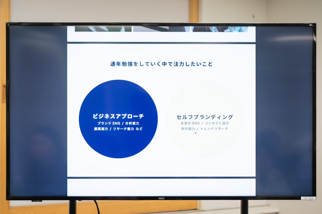 大森講師「僕自身も今年は、YouTubeを頑張りたいなと思っています。一昨年のクラスはYouTubeチャンネルを運営していました。写真を撮れたり、グラフィックを作るのが得意な人は山ほどいます。その中で、自分の強みを認識して!皆さん、クリエイティブなことをしやすい環境に生きています!例えばファッションブランドをやりたい人、どこで売りますか?原宿でテナントを借りる?