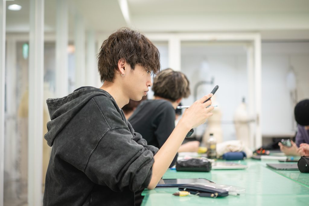 大森講師「ファッションプロデュース科へは、将来就きたい仕事を考え、洋服が好きという気持ちで入りました。1年次、アパレルでアルバイトをしようと考え、原宿キャットストリートの古着屋さんで販売員のアルバイトをスタートしました。スクールで、さまざまな授業を受けるうちに、自分は『デジタルデザイン』の分野がすごく楽しいと感じ、実践にうつしたいなと思いました!」