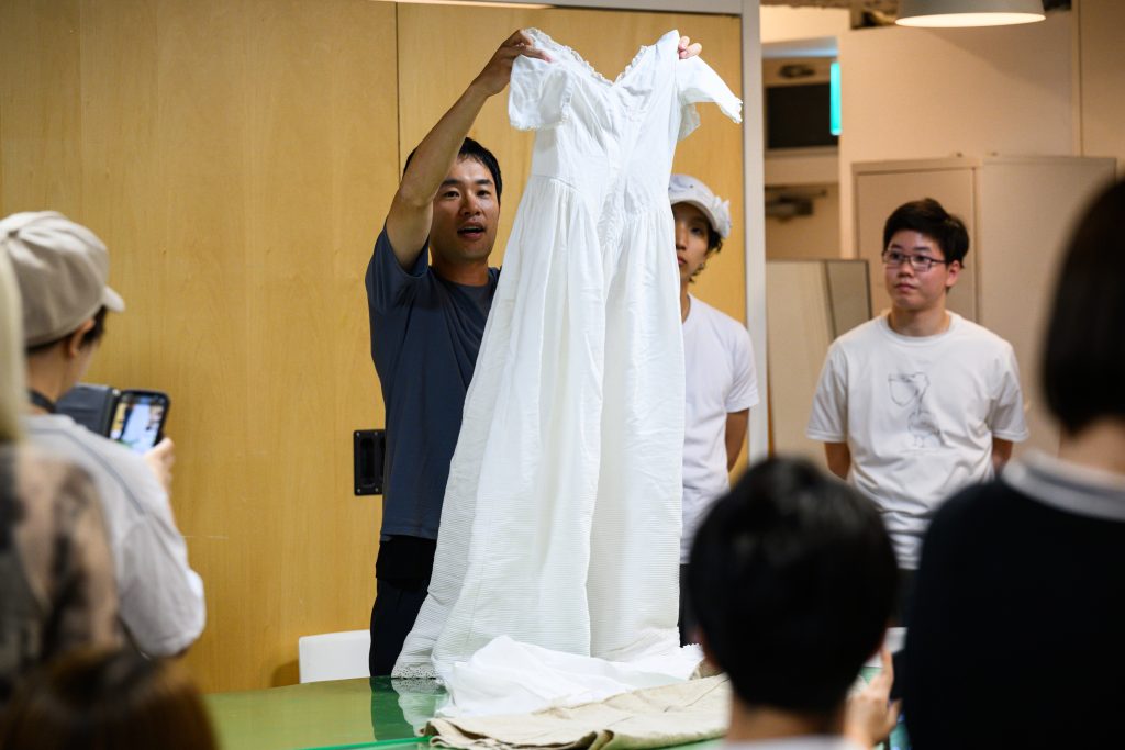 「古い服の超オタク、ガチ勢です。推しを持ってきたので、愛でたいです。テーブルには、300年以上前の衣服、イギリスやアメリカの美術館に展示されているような衣服や、数百万円もする貴重な洋服もあります。色んな発見があるんじゃないかなと思っています」と話す、衣服標本家・長谷川彰良さん。ガラスのない美術館「半・分解展」を主宰しています。