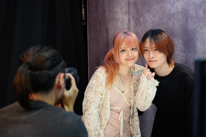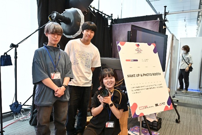 ヘアメイク専攻がワンポイントフェイスデコレーションを行い、フォトグラフィ専攻がプロフェッショナルな機材で撮影を行うブース。