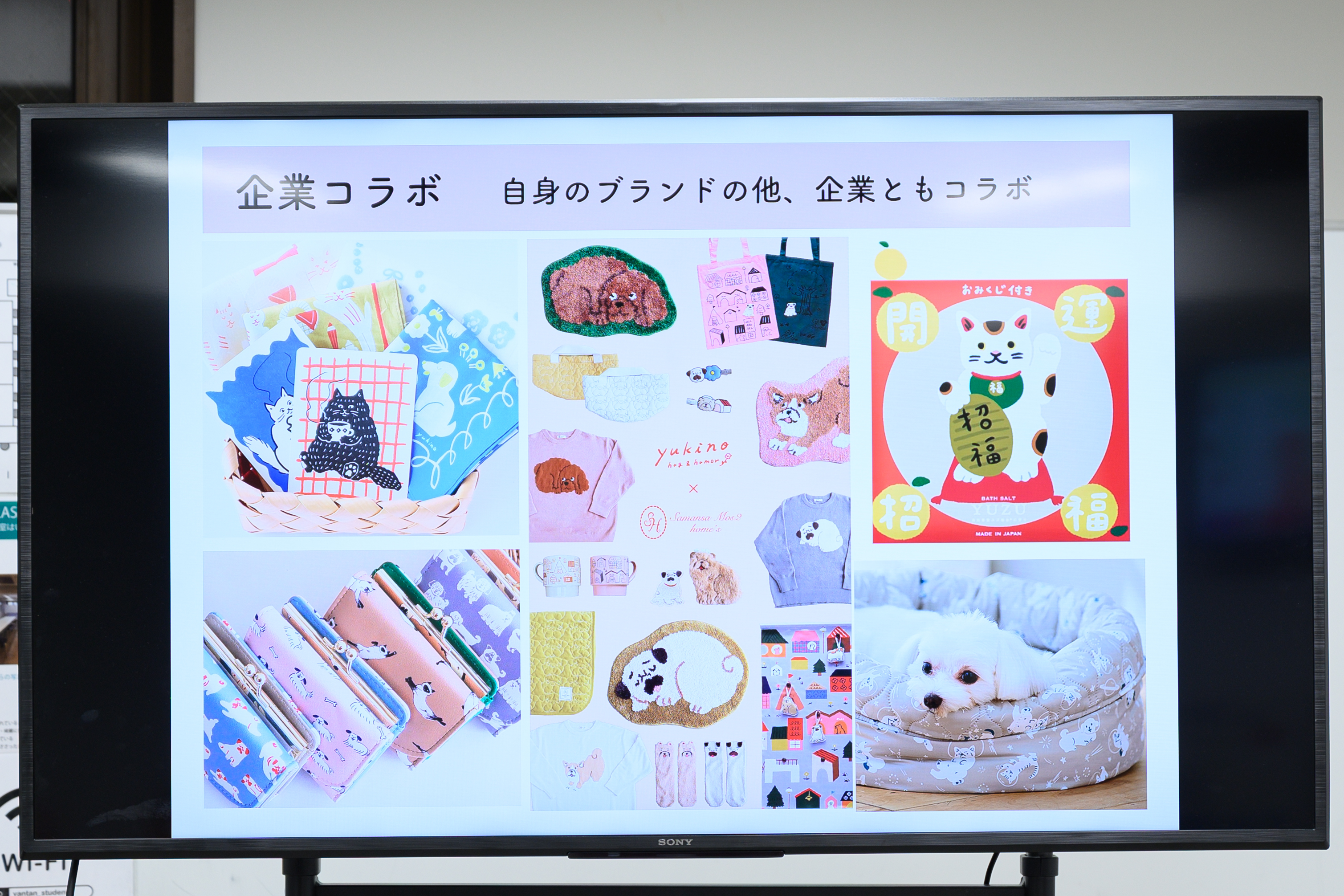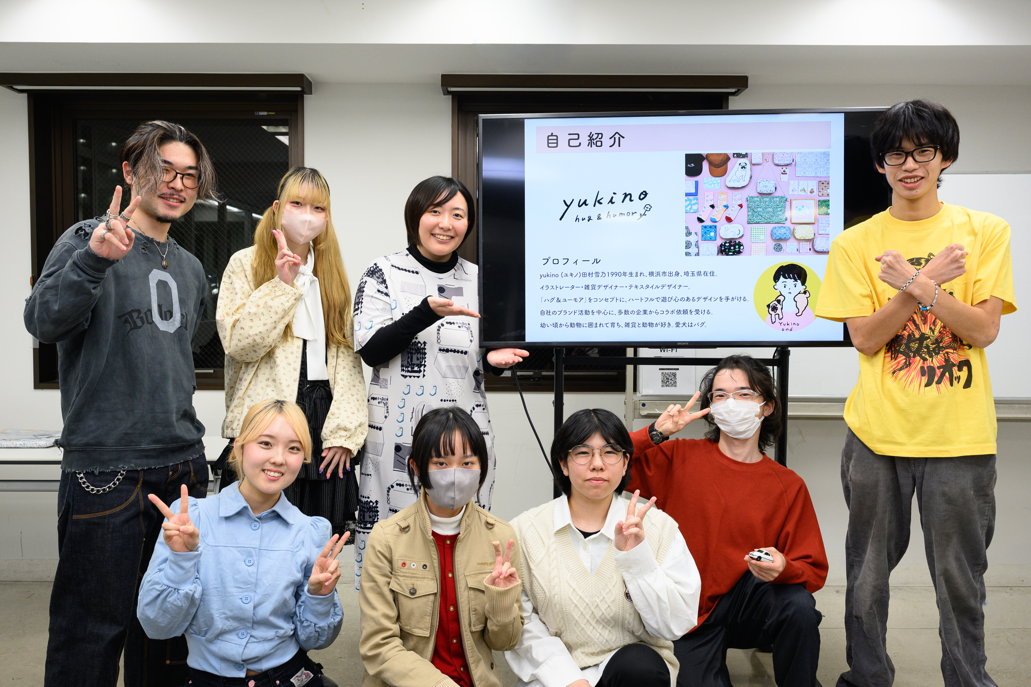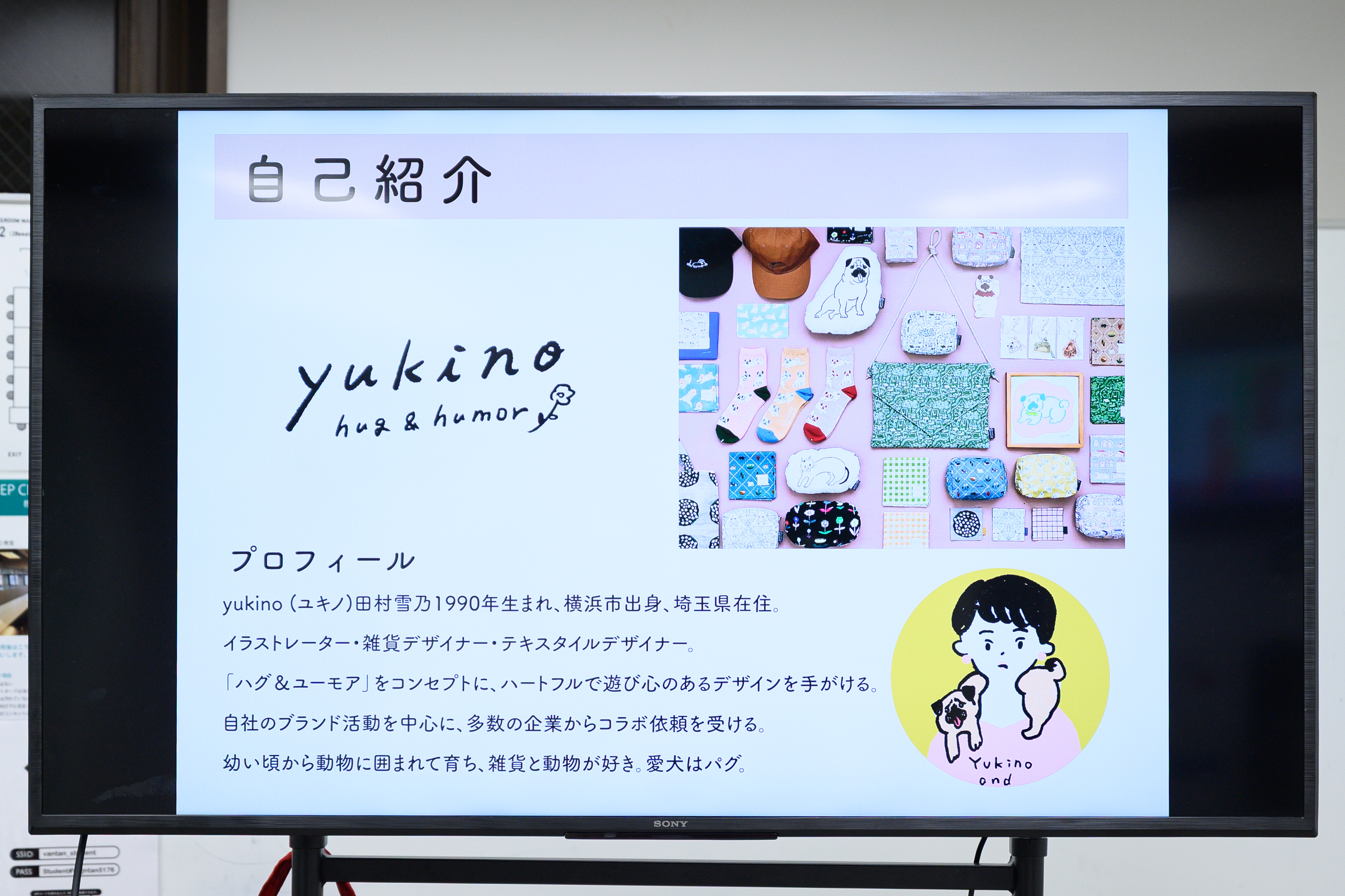 yukino講師「イラストレーター・雑貨デザイナー・テキスタイルデザイナーとして活動しています。雑貨ブランドも運営していて、百貨店などでポップアップショップも行っています。『ハグ&ユーモア』というコンセプトに共感してくださった企業さんとのコラボレーションや、アイテムの企画立案、商品仕様までトータルで携わる“ディレクション”も行っています!」と自己紹介。