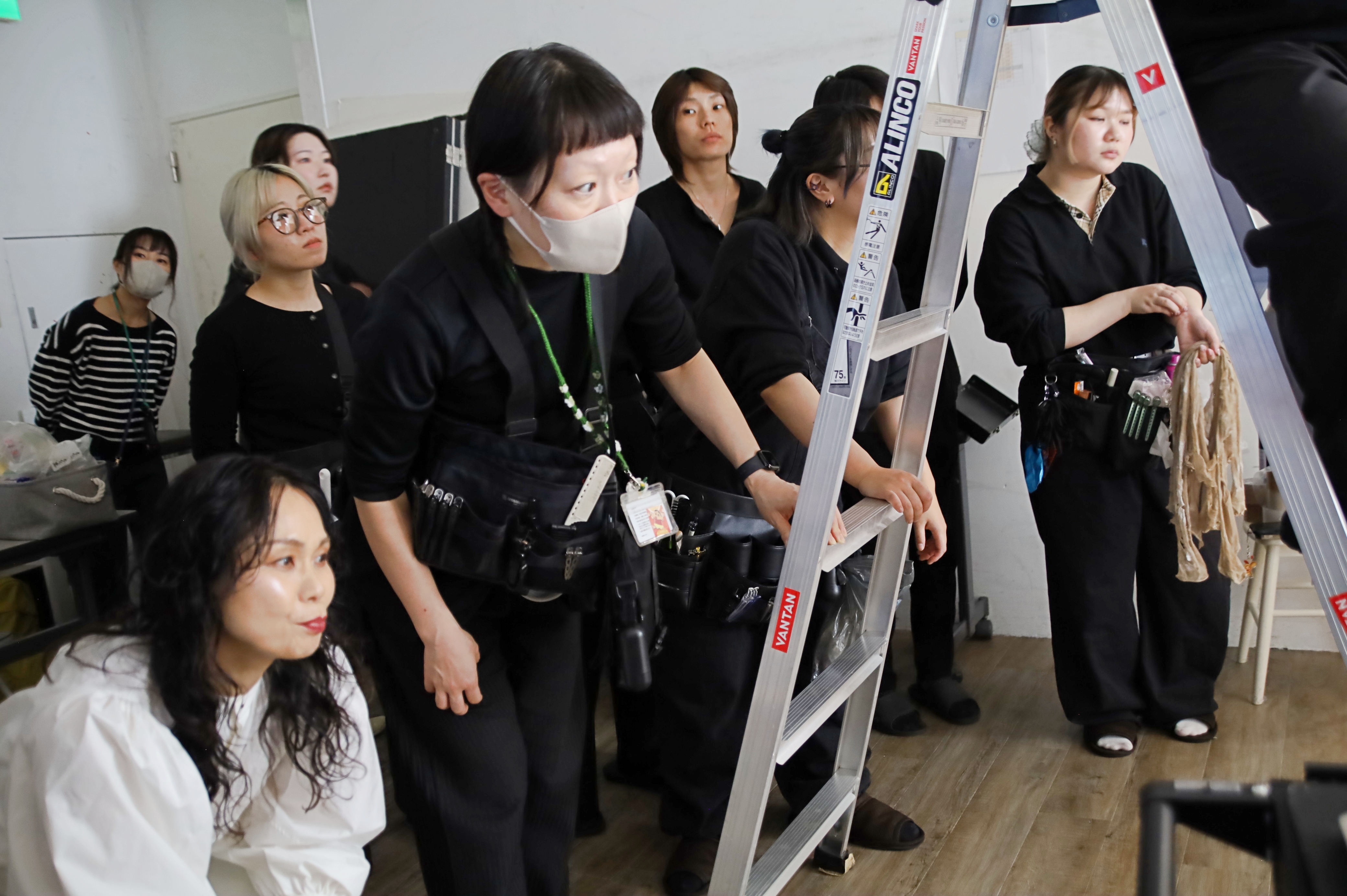 現在はダンサーさんのソロ撮影が終わり、プロデューサーのNORIさんのヘアメイクを、先生にアドバイスをもらいながらメンバー2人が仕上げています。